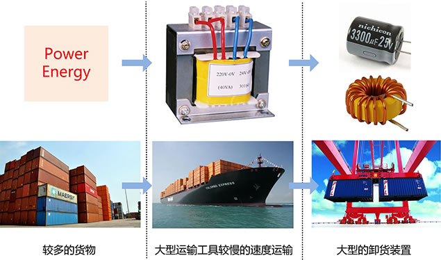 1、線性電源就像用大船(工頻變壓器)來運輸貨物(能量),速度較慢(50Hz的工頻頻率),但一次性能運輸較多的貨物(能量)。到達(dá)目的地(電源輸出)后,再用較大的卸貨裝置如集裝箱吊具卸貨(大的電感、電容濾波),如下圖。