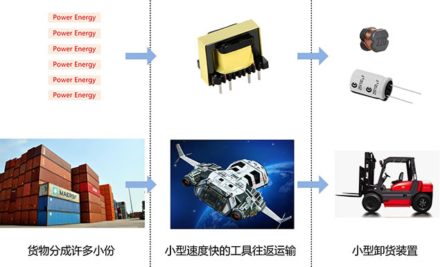 2、開關(guān)電源就像用宇宙飛船(高頻變壓器)來運輸貨物(能量),因飛船的載重量有限,在運輸前,先把貨物分成許多小份(開關(guān)電源把電能量斬波成許多小的能量包),高速度(高的開關(guān)頻率,幾十上百KHz)多次往返運輸,到達(dá)目的地(電源輸出)后,再用小型卸貨裝置如小叉車卸貨(用小的電感、電容濾波),如下圖。