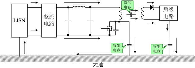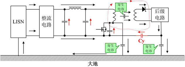 開(kāi)關(guān)電源工作時(shí),電源變壓器的寄生電容將共模騷擾傳遞到后級(jí)電路上,經(jīng)后級(jí)電路后,共模騷擾會(huì)通過(guò)與大地的寄生電容傳遞到大地,再由大地傳遞到傳導(dǎo)測(cè)試儀器(LISN),最后回到初級(jí),共模騷擾傳輸路徑如圖2黑色箭頭所示。如果沒(méi)有Y電容,絕大部分的共模騷擾都會(huì)經(jīng)大地流經(jīng)LISN回到初級(jí),導(dǎo)致LISN檢測(cè)到的傳導(dǎo)騷擾超標(biāo)。