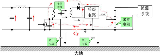 加入Y電容后,我們需要考慮安規(guī)方面初次級(jí)的漏電流問(wèn)題,以及由于漏電流存在導(dǎo)致的測(cè)量誤差問(wèn)題。一般安規(guī)漏電流比較容易滿足,而在一些測(cè)試系統(tǒng)或儀器中,如電能表、功率分析儀、電能檢測(cè)系統(tǒng)等設(shè)備中,漏電流會(huì)流過(guò)采樣電阻,從而影響電流的采用精度,具體如圖4中右側(cè)紅色虛線所示。所以在此類(lèi)應(yīng)用中需要盡量減小漏電流,甚至直接取消Y電容。所以此時(shí)又要考慮漏電流與EMI的平衡了。