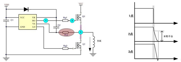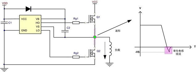 上圖為典型的半橋自舉驅(qū)動(dòng)電路,由于寄生電感的存在,在高端MOS關(guān)閉后,低端MOS的體二極管鉗位之前,寄生電感通過(guò)低端二極管進(jìn)行續(xù)流,導(dǎo)致VS端產(chǎn)生負(fù)壓,且負(fù)壓的大小與寄生電感與成正比關(guān)系。該負(fù)壓會(huì)把驅(qū)動(dòng)的電位拉到負(fù)電位,導(dǎo)致驅(qū)動(dòng)電路異常,還可能讓自舉電容過(guò)充電導(dǎo)致驅(qū)動(dòng)電路或者柵極損壞。由于IC的驅(qū)動(dòng)端通常都有寄生二極管,當(dāng)瞬間的大電流流過(guò)驅(qū)動(dòng)口的二極管時(shí),很可能引發(fā)寄生SCR閉鎖效應(yīng),導(dǎo)致驅(qū)動(dòng)電路徹底損壞。