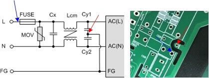 根據(jù)理論分析,此電路可以順利通過L/N對(duì)FG的2KV共模浪涌測(cè)試,但是在實(shí)際測(cè)試中發(fā)現(xiàn)經(jīng)過5~10次測(cè)試后,電源模塊出現(xiàn)損壞。