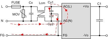 從上圖PCB可以看出,焊接金屬保險(xiǎn)絲底座后,導(dǎo)致兩者之間的距離變小。從而在浪涌測(cè)試時(shí),導(dǎo)致放電現(xiàn)象發(fā)生,最終損壞模塊內(nèi)部壓敏電阻。如在N對(duì)FG打浪涌時(shí),能量釋放路徑見下圖: