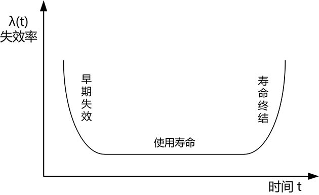 曲線的形狀呈兩頭高,中間低,具有明顯的階段性,可劃分為三個(gè)階段:早期的失效故障(隨時(shí)間推移快速下降),使用壽命期的故障(故障率較低,且比較穩(wěn)定),壽命后期的故障(接近產(chǎn)品的使用壽命,故障率劇增)。