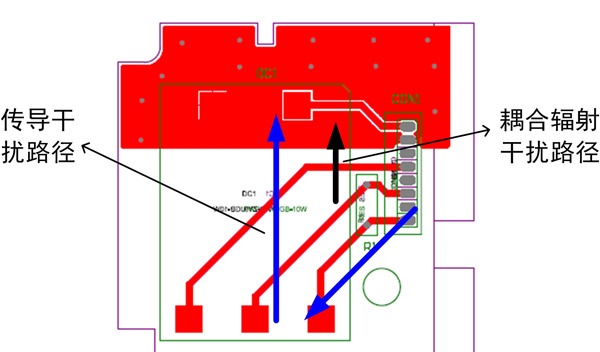 經(jīng)過查看供電電路板,分析總結(jié)出以下干擾路徑,具體見下圖:
