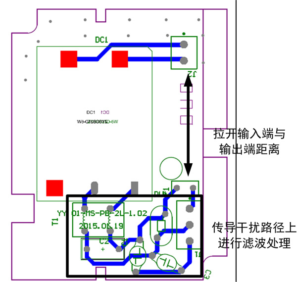 - 2、傳導干擾路徑的整改:傳導干擾主要是通過電源元器件布線路徑干擾到用電設(shè)備的,此部分干擾需要在傳導路徑上進行濾波處理。