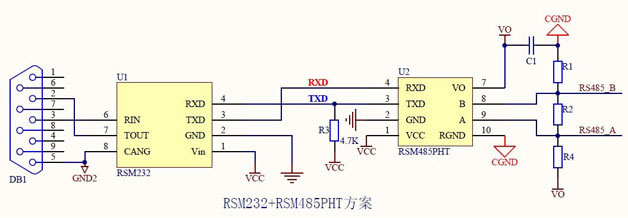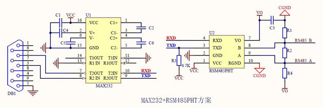 上圖中的方案,是采用MAX232芯片加上廣州致遠(yuǎn)電子的RSM485PHT設(shè)計(jì)的隔離轉(zhuǎn)換電路,此設(shè)計(jì)電源與RS232未隔離,RS232與RS485總線端是隔離開(kāi)的,這樣進(jìn)行隔離設(shè)計(jì)可以有效的抑制RS485總線上的干擾傳導(dǎo)到232端。