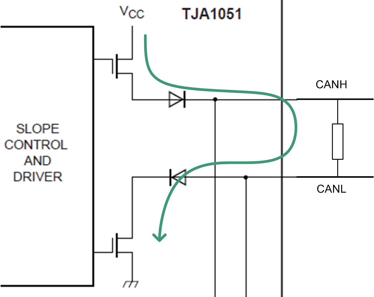 CAN收發(fā)器內(nèi)部CANH、CANL分別為開源,開漏輸出形式,驅(qū)動電路如圖 3所示。這種方式可以使總線輕松實現(xiàn)顯性電平的驅(qū)動,而隱性電平則通過終端電阻放電來實現(xiàn)。