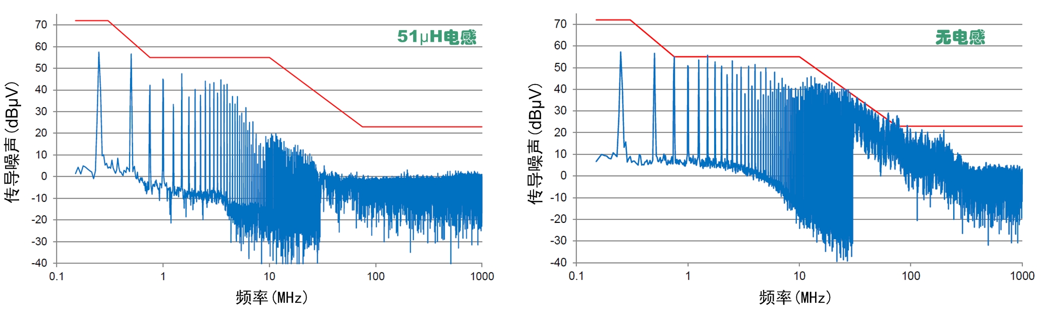 圖3 共模干擾及傳輸路徑對于CAN接口的EMC問題,除了選用更好性能,符號要求的CAN收發(fā)芯片,另一種簡單的方法就是對CAN接口增加外圍,共模電感是一種很好的選擇。在現(xiàn)有汽車電子CISPR 25標(biāo)準(zhǔn)中,對傳導(dǎo)騷擾限值有很嚴(yán)格要求。許多CAN收發(fā)器均會超過限值。如圖 5分別為按照車規(guī)限制測試增加和不加共模電感的CAN接口傳導(dǎo)騷擾,共模電感值為51μH,可以看到在各個頻段下對噪聲改善較為明顯,測試結(jié)果仍有很大裕量。