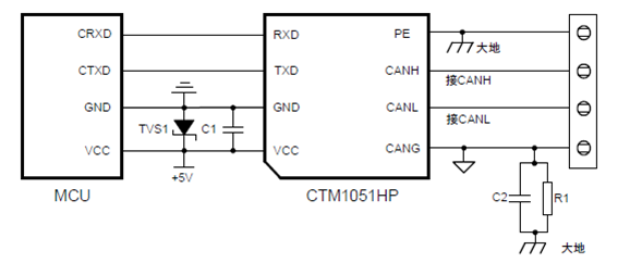 廣州致遠(yuǎn)電子有限公司基于多年的總線防護(hù)設(shè)計積累推出了高防護(hù)等級隔離模塊——CTM1051(A)HP系列。該系列符合國際ISO11898-2標(biāo)準(zhǔn),靜電防護(hù)等級可達(dá)接觸±8kV,空氣放電±15kV,浪涌防護(hù)可達(dá)±4kV隔離CAN解決方案,具體如下圖15所示,能夠適用于各種惡劣的工業(yè)現(xiàn)場環(huán)境。應(yīng)用簡便,即插即用,應(yīng)用原理圖如下圖16所示。