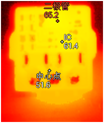 熱成像儀觀測發(fā)熱電源模塊E7805OS-500在標稱電壓下的溫度分布,如圖2所示:
