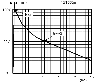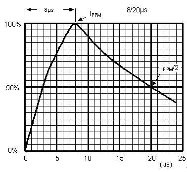 峰值電流IPP:TVS管允許通過的10/1000μs或8/20μs波的最大峰值電流。超過這個電流可能造成永久性損壞。由于功率限制,擊穿電壓高的管子允許通過的峰值電流越??;
