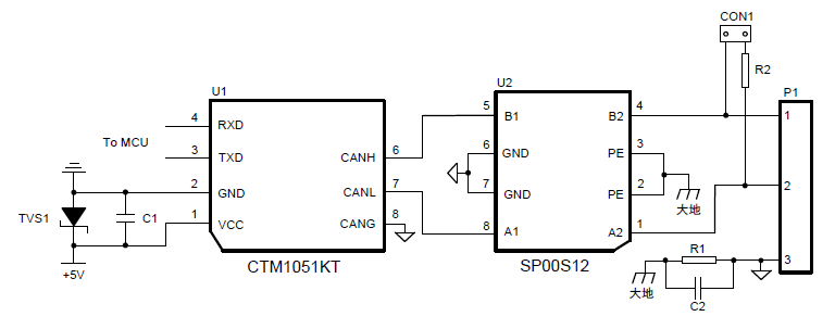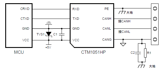 CTM1051(A)HP系列是致遠(yuǎn)電子有限公司最新推出的高防護(hù)等級隔離CAN收發(fā)器,符合國際ISO11898-2標(biāo)準(zhǔn),靜電防護(hù)等級可達(dá)接觸±8kV,空氣放電±15kV,浪涌防護(hù)可達(dá)±4kV隔離CAN解決方案,具體如下圖6所示,能夠適用于各種惡劣的工業(yè)現(xiàn)場環(huán)境。應(yīng)用簡便,即插即用,應(yīng)用原理圖如下圖7所示。