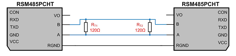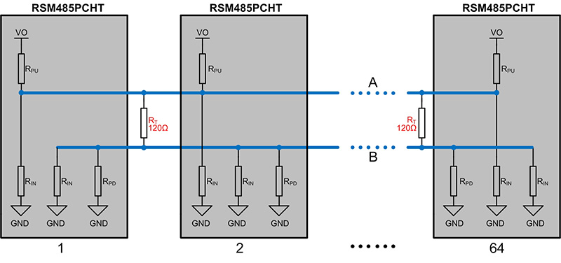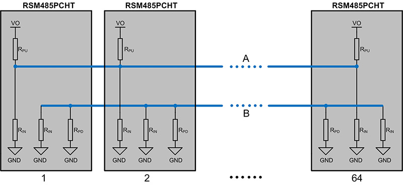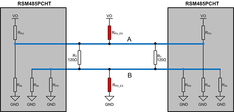 因此為了防止485總線出現(xiàn)上述情況,通常在485總線上增加上下拉電阻(通常A接上拉電阻,B總線下拉電阻)。若使用隔離RS-485收發(fā)模塊(例如RSM485PCHT),由于模塊內(nèi)部具有上下拉電阻(對(duì)于RSM485PCHT,內(nèi)部上下拉電阻為24kΩ),因此在模塊外部一般不需要增加上下拉電阻。