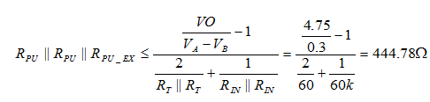 由于RSM485PCHT的門限電平為-200mV~+200mV,一般留有100mV或200mV的電壓裕量,本例留有100mV的電壓裕量,根據(jù)前面所推導(dǎo)的差分電壓公式,可以得到下面計(jì)算公式