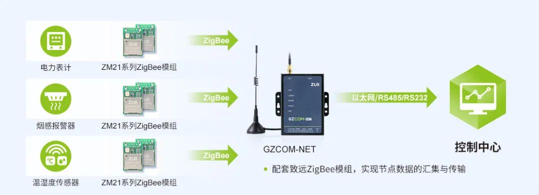 致遠(yuǎn)電子ZM21系列Zigbee無線模組具有穩(wěn)定性高,組網(wǎng)方便快捷的特點(diǎn),可配備在每個(gè)照明燈具控制器上,與GZCOM-NET Zigbee網(wǎng)關(guān)組成通信網(wǎng)絡(luò),同時(shí)GZCOM-NET網(wǎng)關(guān)可以將Zigbee信號(hào)轉(zhuǎn)換成以太網(wǎng)信息,直接將燈具的實(shí)時(shí)狀態(tài)上傳到服務(wù)器。服務(wù)器也可通過網(wǎng)絡(luò)下發(fā)控制信息,來分組分區(qū)調(diào)節(jié)、控制各個(gè)照明燈具。