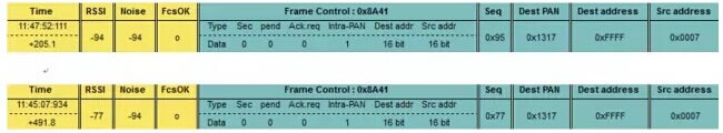 第一步:在網(wǎng)絡(luò)覆蓋范圍內(nèi),在固定點(diǎn)使用ZigBee分析儀進(jìn)行網(wǎng)絡(luò)監(jiān)控,監(jiān)控發(fā)現(xiàn)路由下行信息正常發(fā)送,但存在一定概率無法正常到達(dá)故障終端節(jié)點(diǎn),而Packet-Analyzer數(shù)據(jù)顯示無線信號覆蓋距離完全足夠。一般認(rèn)為節(jié)點(diǎn)接收機(jī)可能存在問題。