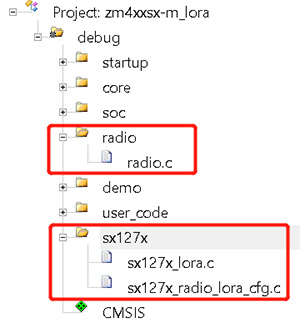 在該驅(qū)動例程中,前三個文件夾:startup、core、soc與具體用戶的MCU相關(guān),不用移植。Demo文件夾下面放的是致遠(yuǎn)電子提供的例程代碼,用戶可以選擇性移植。User_code文件夾下存放用戶的應(yīng)用程序,可以不用移植。真正且必須移植的是radio和sx127x這兩個文件夾下面的代碼,這兩個文件夾下包含的是驅(qū)動和配置代碼。