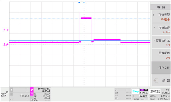 在測(cè)量模組正常工作模式的發(fā)射電流時(shí),由于信號(hào)發(fā)射所需要的時(shí)間很短,整個(gè)電流是處于變化狀態(tài),我們稱之為動(dòng)態(tài)電流。萬(wàn)用表響應(yīng)時(shí)間比較慢,很難捕捉到變化的電流,所以不能使用萬(wàn)用表測(cè)量,對(duì)于變化電流,需要使用示波器和電流探頭進(jìn)行測(cè)量,測(cè)量結(jié)果如下圖 2。