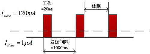 上文數(shù)據(jù)來(lái)源于我司LM400TU產(chǎn)品,按照上圖所示,兩個(gè)發(fā)送包之間的發(fā)送間隔為1000ms,計(jì)算平均電流: