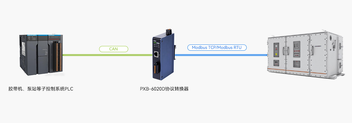 在膠帶機(jī)、風(fēng)機(jī)控制、泵站等礦站子系統(tǒng)中,每個(gè)控制系統(tǒng)往往采用PLC作為主站控制器,大部分PLC本體是不支持CAN通訊的,然而在整個(gè)礦下系統(tǒng)中,這些主控往往需要控制走CAN通訊的變頻器等產(chǎn)品。采用PXB-6020D,可以輕松實(shí)現(xiàn)CAN設(shè)備接入Modbus主站控制器,支持Modbus TCP(工業(yè)以太網(wǎng))和Modbus RTU(RS485)兩種接入方式,滿足您各類需求。