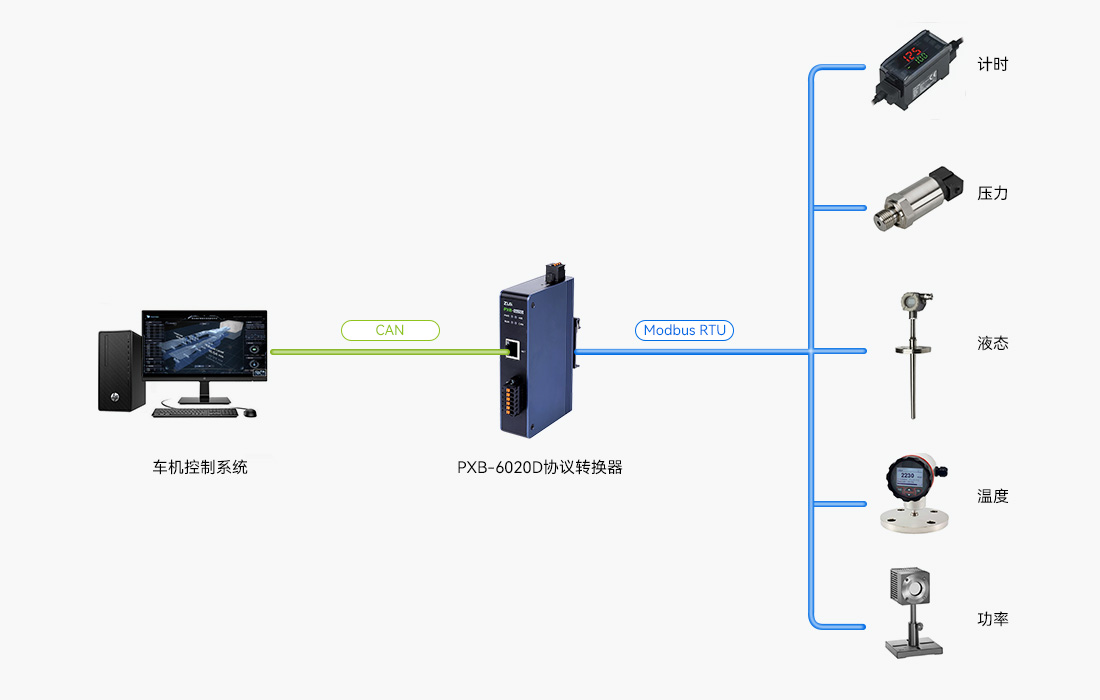 在掘進(jìn)機(jī)、采煤機(jī)系統(tǒng),車機(jī)系統(tǒng)通常走CAN總線,而不是所有傳感器都支持CAN通訊方式,偶爾需要將RS485傳感器接入車機(jī)系統(tǒng),采用PXB-6020D,同樣可以非常簡(jiǎn)便的將Modbus RTU傳感器接入CAN車機(jī)系統(tǒng),實(shí)現(xiàn)控制系統(tǒng)對(duì)車機(jī)各個(gè)狀態(tài)的監(jiān)控。