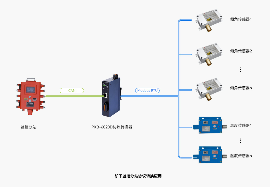 在一些系統(tǒng),往往需要接入傾角傳感器、溫度傳感器等傳感設(shè)備,這些測(cè)量點(diǎn)位多用RS485作為通訊方式,分站不一定有足夠的RS485接口接入這些傳感器信號(hào),這就需要通過(guò)PXB-6020D將傳感器Modbus RTU信號(hào)轉(zhuǎn)換為CAN接入分站。采用PXB-6020D協(xié)議網(wǎng)關(guān)進(jìn)行轉(zhuǎn)換,可以避免大量的協(xié)議代碼轉(zhuǎn)換開(kāi)發(fā)工作,只需連線并且通過(guò)我們免費(fèi)的上位機(jī)軟件簡(jiǎn)單配置,就能輕松實(shí)現(xiàn)系統(tǒng)的互聯(lián)互通。