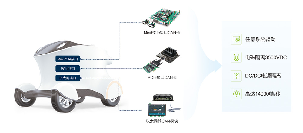 目前無人配送部分執(zhí)行部件與行走電機均采用CAN-bus現(xiàn)場總線通訊,而高端AI的IC和工控機都缺乏CAN接口設計。基于此需求,ZLG推出MiniPCIe接口、PCIe接口和以太網接口等多種CAN接口擴展方案。