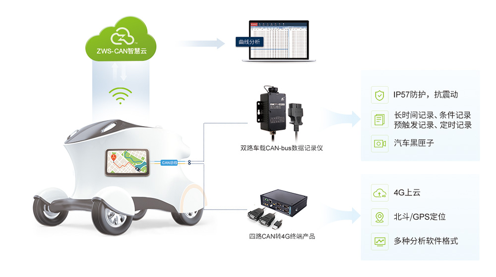 隨著無人配送行業(yè)進程不斷推進,總線數(shù)據(jù)記錄和實時定位需求顯得尤為重要。同時,試驗車和路試都需要不斷進行路徑和算法的優(yōu)化。ZLG針對此行業(yè)痛點,為行業(yè)用戶提供“CANDTU系列產品+ZWS-CAN智慧云”方案。