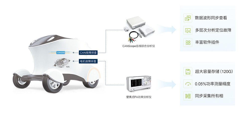 無人配送故障排查方面,ZLG提供CANScope分析儀系列產品和便攜式PA2000mini功率分析儀。針對底層線控故障問題,CANScope分析儀可從物理層、鏈路層和應用層快速定位故障,以便優(yōu)化線控設計。基于電機效率和整機功耗控制需求,便攜式PA2000mini功率分析儀可輕松進行上車測試。