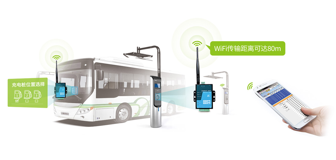 ZLG推出新能源汽車無線充電控制方案,助力新能源汽車與充電弓的通信匹配。通過分別在汽車和充電弓中內(nèi)置CANWiFi-200T轉(zhuǎn)換器,并對應設置為AP和Station模式,即可完成握手匹配,實現(xiàn)降弓充電。在充電過程中,用戶可通過駕駛艙屏幕實時查看電池容量、電壓、電流等參數(shù),保證充電安全。