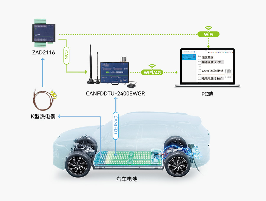 在整車熱平衡測試、發(fā)動機溫度檢測和電池溫度管理等整車測試項目中,往往需要一并采集各零部件控制單元(ECU)的CAN(FD) 通訊數(shù)據(jù)及其工作溫度,此時 CAN(FD)-bus 數(shù)據(jù)記錄終端搭配 ZAD 多通道無線溫度采集器即可實現(xiàn)此需求,數(shù)據(jù)可存至本地硬盤 /TF 卡,也支持通過 4G/WIFI 等無線方式傳至pc,滿足用戶終端的大數(shù)據(jù)處理。