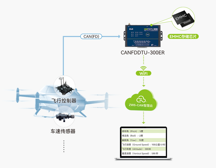 在飛行汽車中,CAN 總線通訊主要用于連接各種電子控制單元(ECU),如飛行控制器、電子速度控制器(ESC)、傳感器、執(zhí)行器和其他外圍設備。飛行模式下,飛行控制器實時接收速度、高度、姿態(tài)等各種傳感器數(shù)據(jù);地面行駛模式下,各類傳感器還需要支持飛行汽車在地面行駛時的制動、轉(zhuǎn)向和動力分配等操作。CAN 總線通訊系統(tǒng)在確保飛行汽車安全、高效運行中扮演著至關重要的角色。CANFDDTU-300系列默認配置64GB EMMC存儲芯片,具備較強的抗震性能。
