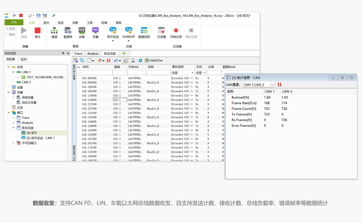 ZXDoc是廣州致遠電子股份有限公司為滿足新能源汽車研發(fā)、測試、產(chǎn)線生產(chǎn)所需而開發(fā)的國產(chǎn)汽車總線工具鏈,支持CAN、CAN FD、LIN、車載以太網(wǎng)數(shù)據(jù)收發(fā)、配備數(shù)據(jù)回放功能、可實現(xiàn)DBC解析、UDS診斷、SOME/IP、ECU刷寫、XCP/CCP標定、仿真等多項應用層功能。是進行CAN FD/LIN/車載以太網(wǎng)總線測試、監(jiān)控、診斷、開發(fā)的好幫手。