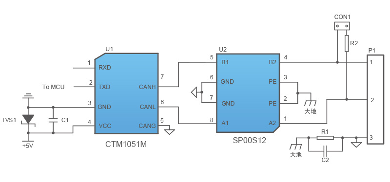 在吊掛系統(tǒng)中的每一個(gè)傳輸節(jié)點(diǎn)上使用CTM隔離CAN收發(fā)器,搭配SP00S12浪涌保護(hù)器,實(shí)現(xiàn)節(jié)點(diǎn)通訊防護(hù),保證主站與動(dòng)作節(jié)點(diǎn)的通訊穩(wěn)定性。