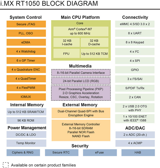 i.MX RT1052雖然采用了MCU內核,但基于應用處理器的架構方式,既能實現(xiàn)應用處理器的高性能和豐富功能,同時又兼具傳統(tǒng)MCU的易用性和實時低功耗運行特性,填補高性能與易用性之間的空白。