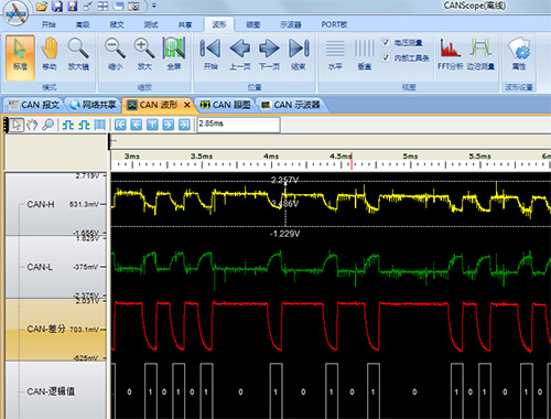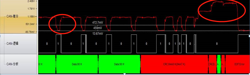 上述內(nèi)容,提到一些簡單的錯誤解決方案,不過,在解決錯誤時,最難的是如何找到錯誤。通常,最簡單的辦法就是將DCU節(jié)點一個一個往上接,直到發(fā)生錯誤為止?;蛘呤褂弥逻h電子研發(fā)的CANScope分析儀,接入到地鐵控制系統(tǒng)中,從CAN底層進行分析,可以更方便去定位錯誤節(jié)點及通過波形分析錯誤原因。