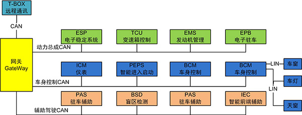 如圖2所示,傳統(tǒng)的汽車網(wǎng)絡(luò)架構(gòu)主要是由CAN總線組成,車內(nèi)分布式電控單元ECU按照功能劃分為動(dòng)力總成、車身控制、輔助駕駛等總線區(qū)域;車窗、車燈、天窗等則通過LIN總線接入CAN網(wǎng)絡(luò)。這也得益于CAN總線通信具有高實(shí)時(shí)性、傳輸距離遠(yuǎn)、抗電磁干擾能力強(qiáng)等優(yōu)點(diǎn)。