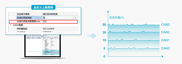 如圖6所示,CANFDNET系列產(chǎn)品支持總線利用率上報(bào),用戶可以在配置軟件中使能總線利用率上報(bào)周期,可實(shí)時(shí)掌握總線負(fù)載信息,防止異常入侵。