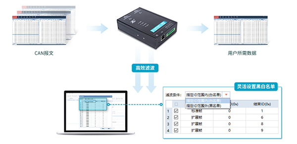 如圖8所示,配置工具支持通道高效率濾波,用戶可根據(jù)所需報(bào)文,靈活設(shè)置黑白名單,實(shí)現(xiàn)數(shù)據(jù)的高效利用。