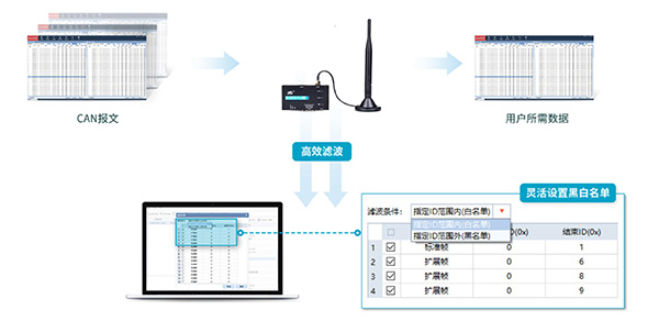 如圖10所示,配置工具支持通道高效率濾波,用戶可根據(jù)所需報文,靈活設置黑白名單,實現(xiàn)數(shù)據(jù)的高效利用。