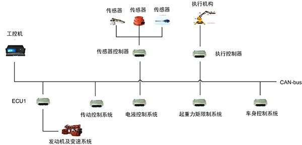 由于CAN-bus總線的可靠性和實(shí)時(shí)性,目前CAN-bus總線技術(shù)已廣泛應(yīng)用于工程機(jī)械中,裝備系統(tǒng)中大都以CAN數(shù)據(jù)總線為通訊基礎(chǔ),如圖2所示,電子控制單元之間通過CAN數(shù)據(jù)總線實(shí)現(xiàn)數(shù)據(jù)傳輸,通過控制程序保證執(zhí)行機(jī)構(gòu)可靠有效的動(dòng)作,實(shí)現(xiàn)工程機(jī)械安全、可靠、高效的運(yùn)行。