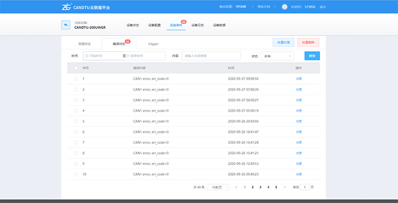 工程機(jī)械裝備在測(cè)試階段遇到問題時(shí),測(cè)試人員很難去分析現(xiàn)場(chǎng)出現(xiàn)的狀況或者判斷裝備運(yùn)行狀態(tài)是否良好,尤其是某些特種工程機(jī)械,應(yīng)用在高原地區(qū)或者極寒地區(qū),都會(huì)使得測(cè)試難度增加。通常情況下,通過對(duì)裝備CAN報(bào)文的分析才可以直觀了解系統(tǒng)各節(jié)點(diǎn)的情況,進(jìn)而進(jìn)一步反饋優(yōu)化系統(tǒng)。如圖4所示,ZWS-CAN云端能夠獲取CAN數(shù)據(jù),也可以獲取到CAN網(wǎng)絡(luò)通信的錯(cuò)誤幀,便于工程師測(cè)試分析。工程師可以遠(yuǎn)程下達(dá)控制命令,極大程度上降低了工程機(jī)械測(cè)試門檻。