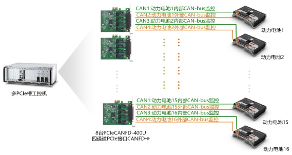 若電池測試項目現(xiàn)場使用多PCIe槽的工控機,ZLG致遠電子提供多通道PCIe接口的PCIeCANFD-400U卡搭載工控機來進行監(jiān)控的方案,外擴4路相互獨立的CAN/CANFD通道,實時監(jiān)控動力電池內(nèi)外CAN/CANFD總線的情況。