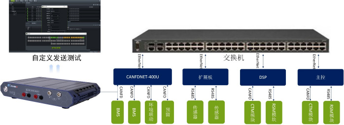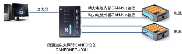 若測試現(xiàn)場采用以太網(wǎng)來實現(xiàn)整個測試情況的監(jiān)控,ZLG致遠電子推出多通道CAN/CANFD轉(zhuǎn)以太網(wǎng)設(shè)備CANFDNET-400U通用方案,通過以太網(wǎng)實現(xiàn)“一拖四”CAN/CANFD相互獨立的通道,甚至ZLG還提供多大8通道的CANET-8E-U,實現(xiàn)8路CAN通道電池數(shù)據(jù)的監(jiān)控。