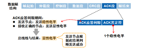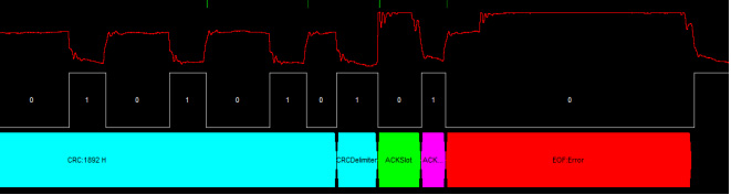 由于 ACK 界定符被前面的應(yīng)答場(chǎng)嚴(yán)重壓縮,導(dǎo)致被某個(gè)節(jié)點(diǎn)識(shí)別為顯性(原本是隱性),所以這個(gè)識(shí)別錯(cuò)誤的節(jié)點(diǎn)后面發(fā)出了錯(cuò)誤幀,進(jìn)行全局通知,讓發(fā)送節(jié)點(diǎn)重新發(fā)送。