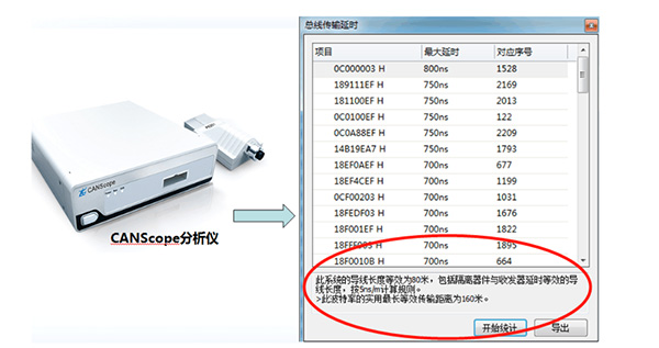 CANScope分析儀可以提供傳輸延遲測(cè)量的功能,可以進(jìn)行單幀的延遲測(cè)量,也可以進(jìn)行所有波形的延時(shí)統(tǒng)計(jì)。如圖3所示,可以通過(guò)延遲測(cè)量出導(dǎo)線的等效長(zhǎng)度,即最大延遲÷5ns/m,并給出該波特率下最長(zhǎng)等效傳輸距離。