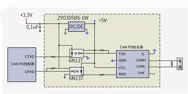 相比上述分立器件的隔離方式,也可以采用隔離收發(fā)器的方案,如圖6所示。例如,CTM5MFD采用磁耦隔離方式,延時(shí)時(shí)間在3~5ns。這種情況下,基本不會(huì)影響總線容許通信線纜長(zhǎng)度。