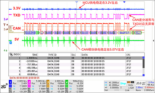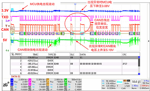對異常板卡進行重復上電,CAN總線出現(xiàn)大量錯誤幀,問題復現(xiàn)。異常時,各點波形如圖5,MCU供電電壓、CAN模塊供電電壓同時出現(xiàn)波動,并出現(xiàn)異常位。異常位出現(xiàn)時,MCU供電下降到3.08V,CAN模塊供電上升至5.19V。