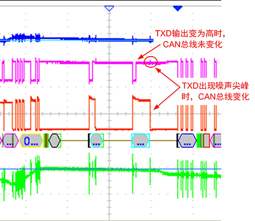 仔細觀察異常位波形,如圖6,發(fā)現(xiàn)TXD變?yōu)楦唠娖綍r,CAN差分電平并未跟隨變化,而當TXD再次出現(xiàn)一個小的噪聲尖峰時,CAN差分電平才變?yōu)殡[性電平。結合此時MCU供電電壓下降,CAN模塊供電反而上升的情況,初步確定問題是因供電電壓波動,造成TXD高電平無法識別導致。